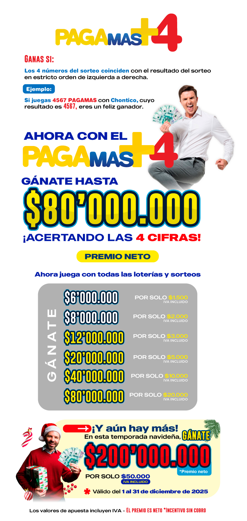 4 Cifras: El premio conservará el valor acumulado a la fecha, para tal fin consultar Tabla de Premiación Doblechance.