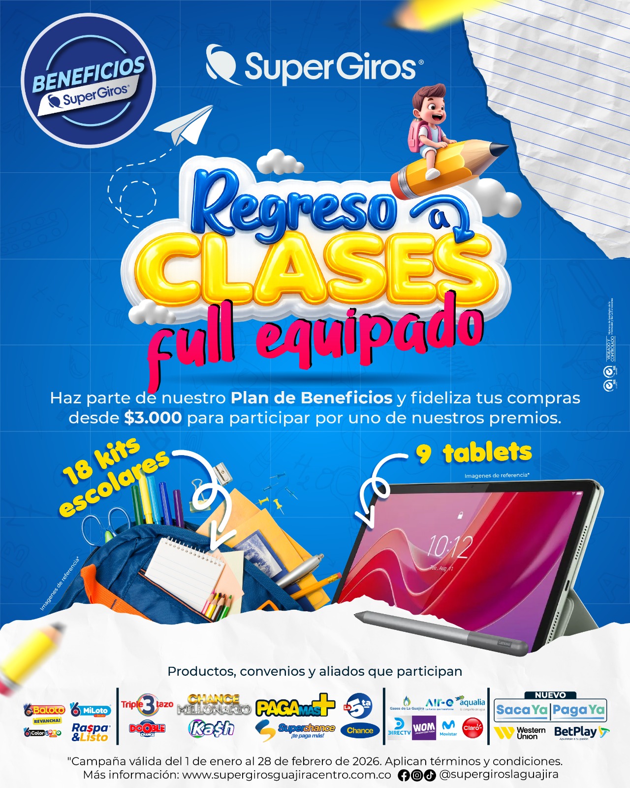 PROCESO DE PARTICIPACIÓN Y CONDICIONES: Del primero (1) de enero al veintiocho (28) de febrero del 2026, para participar los clientes deberán cumplir con las siguientes condiciones: Podrán participar en el promocional “Regreso a clases full equipado” todo cliente que haga parte al plan de beneficio de SuperGiros® y superservicios de la Guajira s.a que fidelicen sus compras por un valor igual o superior a tres mil pesos ($3.000) durante la vigencia del promocional. Entran a participar todo el portafolio de productos y servicios (chance, La Ñapa, SuperChance, Tripletazo, PagaMas, La Quinta, Chance Millonario, Super Astro, Raspa&Listo, kash, Recargas a BetPlay, Baloto, MiLoto, ColorLOTO, Giros nacionales, Giros locales, Giros internacionales, recargas móviles, adquiridos en los puntos SuperGiros®